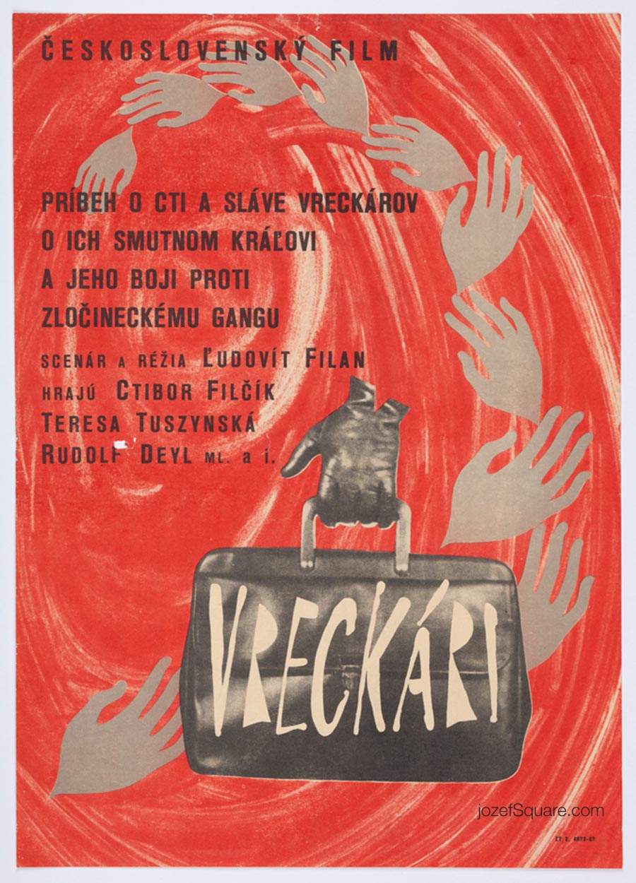Movie poster designed for Ľudovít Filan’s crime comedy drama by collaboration of Slovak born animator, costume designer, director and pedagogue Jan Dudešek and Czech industrial designer Václav Dobrovolný.