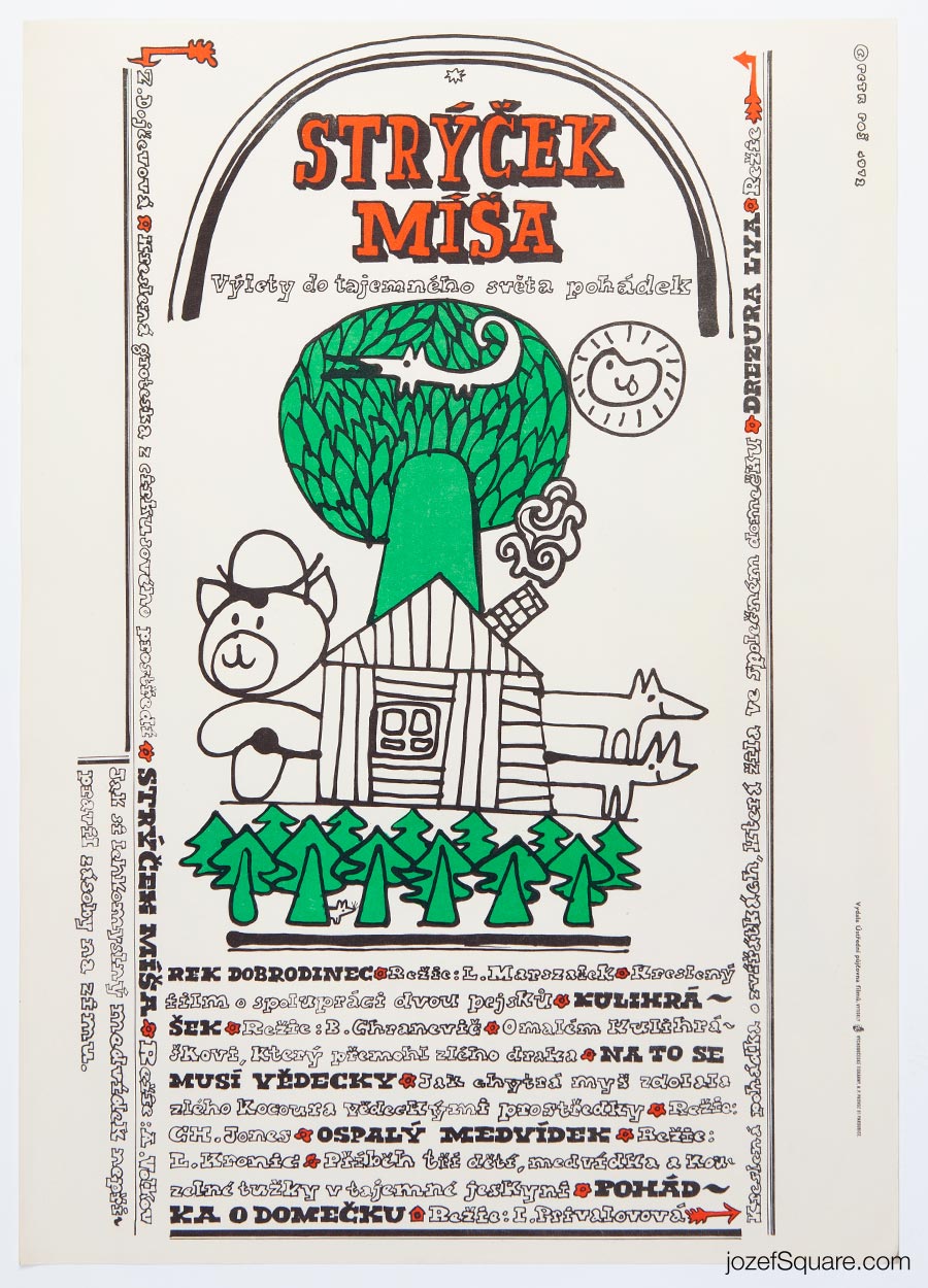 Children’s movie poster designed for Sunday screening of short animation by Czech animator, graphic designer, illustrator and pedagogue Petr Poš.